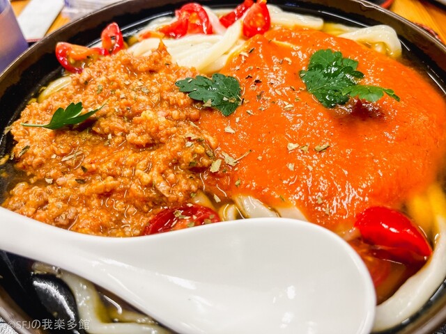 トマトジュレのような麺紡特製ソースと、ピリ辛挽肉のあい盛りに西洋パセリが載った……映えるうどんです。