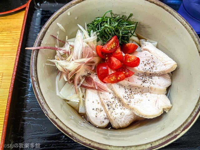 中華そばよろしく、半熟煮卵に鶏ムネ肉、ハムきゅうり、トマトが載ったぶっかけうどん。