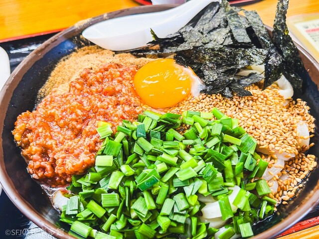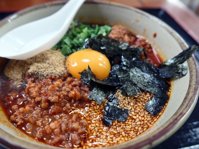左下から肉味噌、魚粉、ニラ、肉味噌、刻み海苔、金ゴマ。そして中央に卵黄。