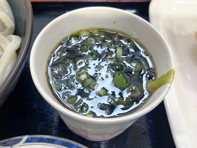 つけ出汁には山葵とネギをたっぷりめに入れ、先日他店でやったら美味しい気がした 無料の揚げイリコも入れちゃいます。