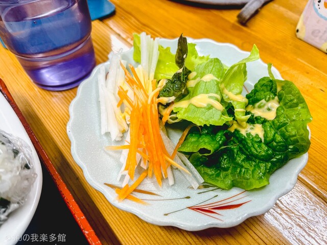 +鶏天+わかめのおむすび。無料のサラダも戴いちゃいます。