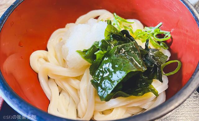 ヨコクラさんのしょうゆうどんは柚がふわっと香る美味しいうどんです。わかめと大根おろしも載ってます。しょうゆも特製のうどんによく合う優しい味のしょうゆです。