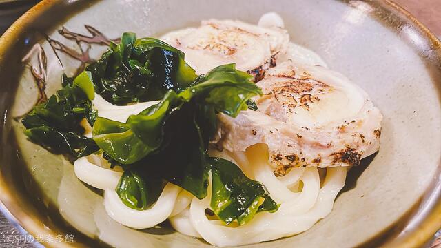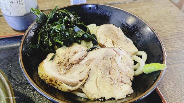 炙った鶏チャーの油と黒胡椒と特製醤油が合体し、そこにワカメが加わり特上の出汁になります。優しいヨコクラさんのうどんが妙にパンチのある醤油うどんに変わります。