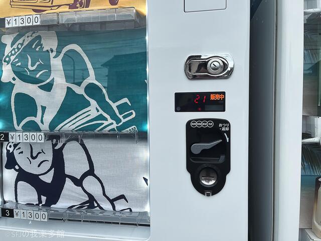 なにやら怪しげな自販機がありました。手拭い自販機ですやーん(一枚1300円)。温度管理もバッチリ?笑(21℃)こんなん……買うでしょ。(買うんだ?)