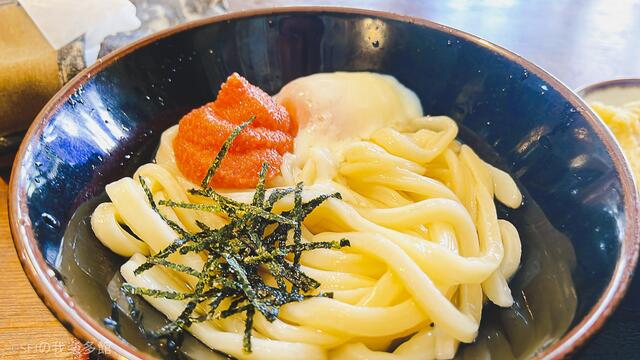 いつものなめこおろしぶっかけも映えますが、こちら温玉明太ぶっかけも負けず劣らず素敵過ぎる容姿です。がっと掻き混ぜて頂くと明太の粒々と温玉のとろみがぶっかけ出汁に溶けて実にマイルドカルボナーラ風おうどんになります。