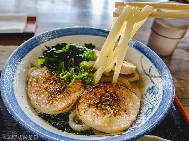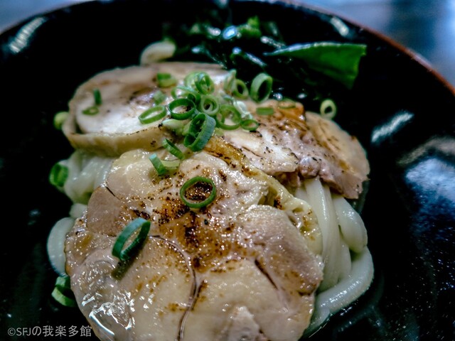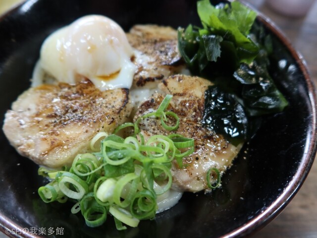 分厚い、低温で下処理された極上の……鶏油たっぷりジューシーな鶏叉焼と、しゃっきしゃきわかめが載ったしょう油うどんですが……麺には葱油もたっぷり掛かっております。