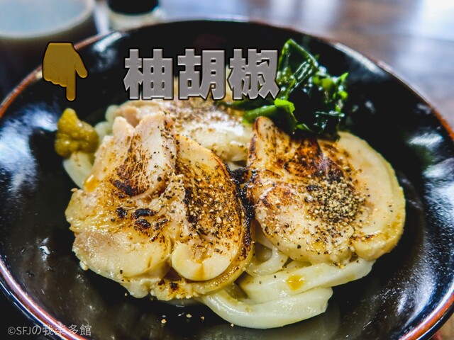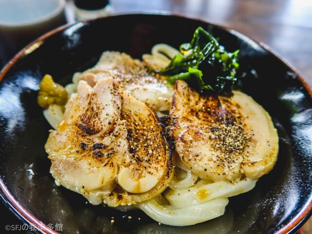讃岐うどんに『炙り系』という新たな分野を提案した創作系ヨコクラ定番メニューは、七味ではなく、黒胡椒がお薦めです。