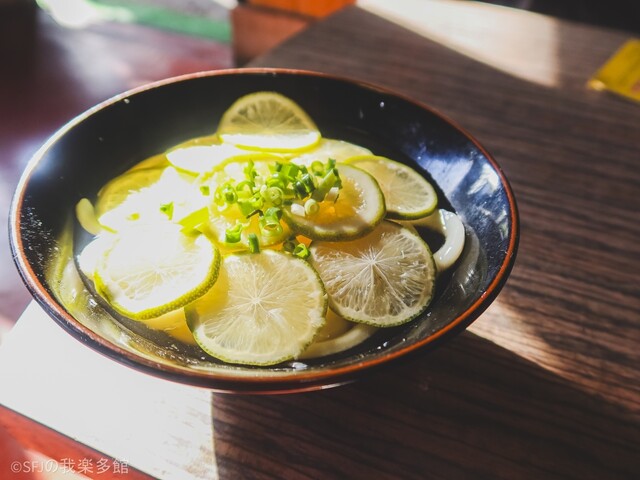 うどんの出汁としてはぶっかけ出汁のほうが合いそうな気がしたんですが……うどんを食べ終わって、出汁を飲むと分かる……璃の香の果汁を含んだ冷やかけだしのその爽やかさはまるで柑橘系清涼飲料水。