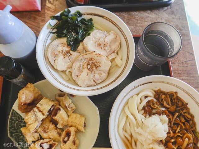 今日の朝ご飯は、檸檬と日向夏をかけ合わせて産まれた「璃の香」が一面に載ってる『冷やし瑠の香うどん』。そしてSFJ定番なめこーる『なめこおろしぶっかけうどん』あと鶏天戴きました。