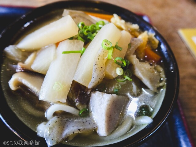 大きい里芋を中心に、大根に人参、牛蒡等 根菜系に椎茸、蒟蒻、すじ肉が入ってる身体の芯からほっこり温まるおうどんです。