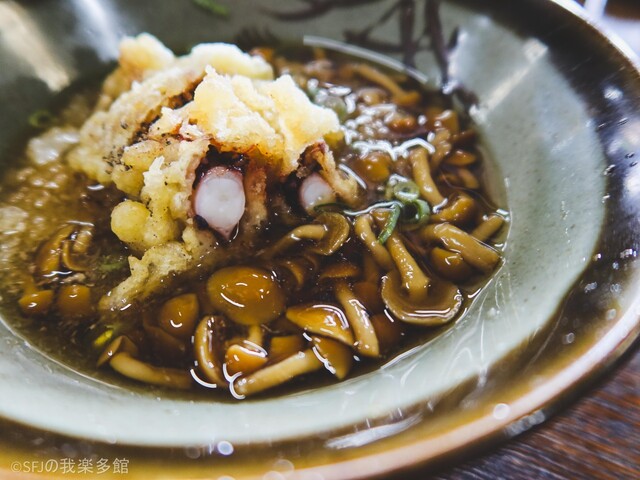 黒胡椒を掛けたゲソ天を残ったなめこのスープに漬けて食べるとこれがまた……タマらんとです。