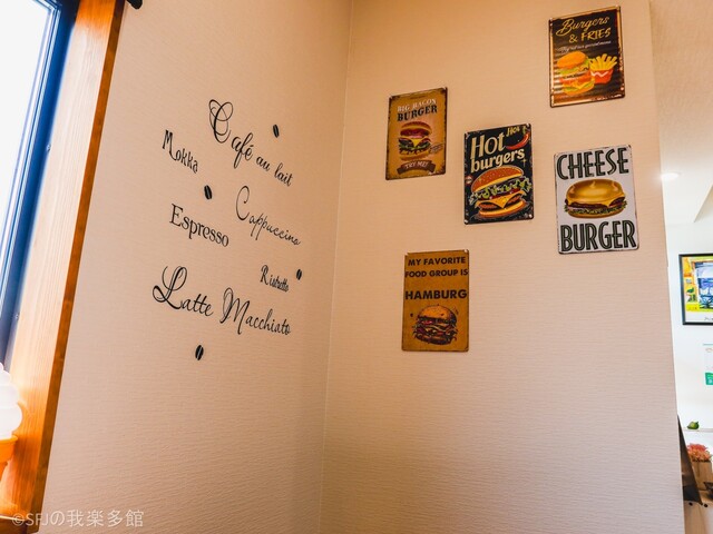 ハンバーガーと珈琲の幟がはためくシンプルな佇まいのお店。