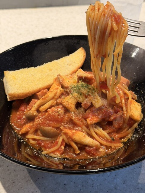 パスタは4種類のうちで一番お安いもので、3種のキノコとベーコン・トマトソースを選択しました。生パスタ独特のモチモチ感がとても良くて、しっかり風味のでたトマトソースも本格的で申し分ありません。バケットも付いてるしサラダもたっぷりでLINE友達になると大盛り無料なのがとても嬉しい。