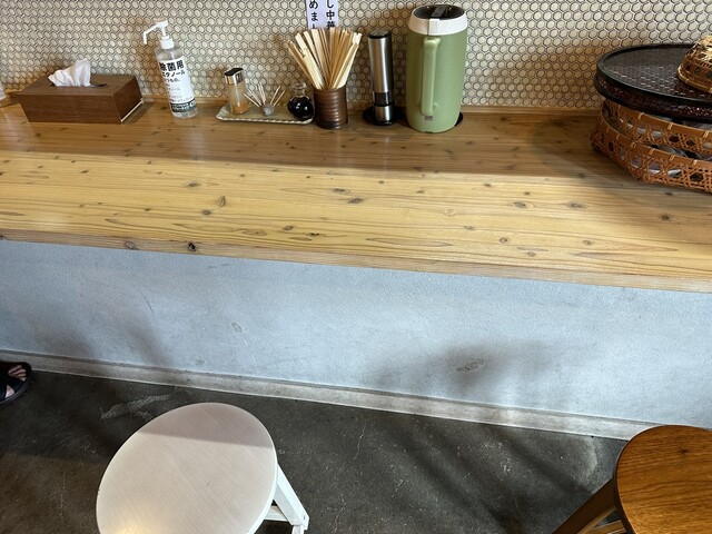 卓上には出汁醤油、一味、ブラックペッパーが置いてあります。