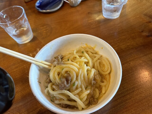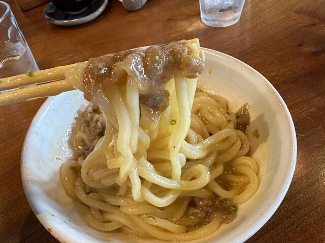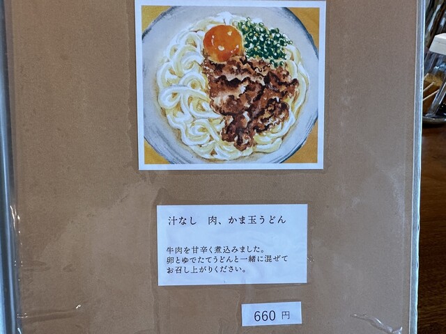 汁なし肉かまたまうどん、甘辛な肉に玉子がのっていて、甘辛な肉が入ってるからかよく混ぜて食べても若干味薄いけど麺も美味いから美味しく頂けるところに、お好みで出汁醤油を加えて啜り上げるとバリ美味い!