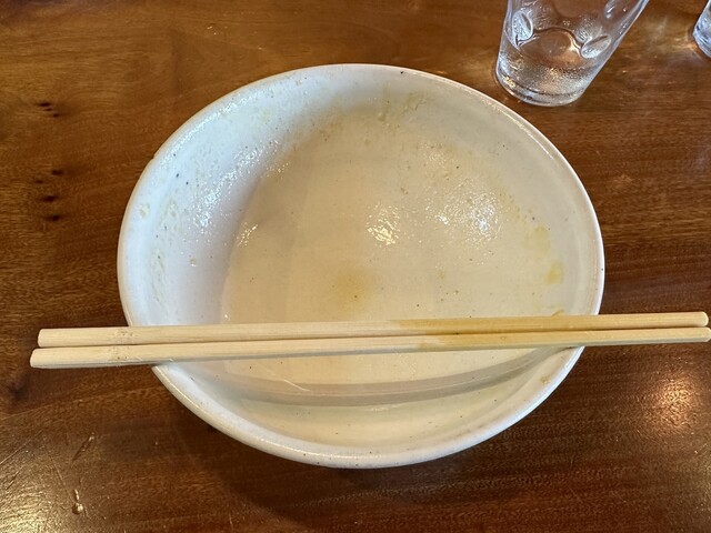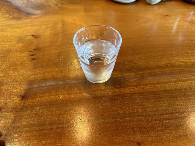 倉庫を改装した店舗は天井が高く、明るい店内は右手側にカウンター席、その奥に厨房、正面と奥にはゆったりめでテーブルが3つくらいだったかな、入口にお冷のコップが置いてあるのてそちらを手に取りテーブルに着席、お冷ポットからお冷を注ぎます。