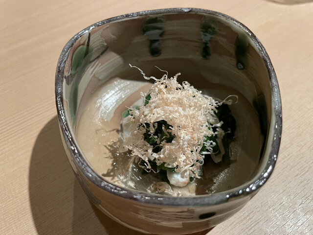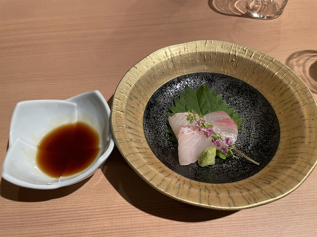 シマアジにはネギと柚子皮を合わせた薬味がのせてあり、歯応えと旨味に爽やかさが加わって極上の味わい。
