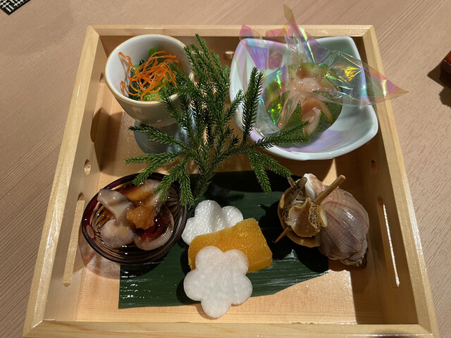 右上から時計回りにカボス皮の珍味盛りで甘えびのコノワタ和え、つぶ貝のうま煮、カラスミ大根、茶ぶりナマコ、菜の花の辛し和え糸雲丹のせ。