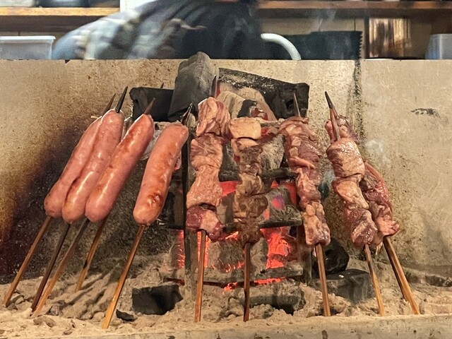 目の前にはガラスケースがあって串焼きを何にするか迷うし、上にはメニューを書いた木札が並んでます。