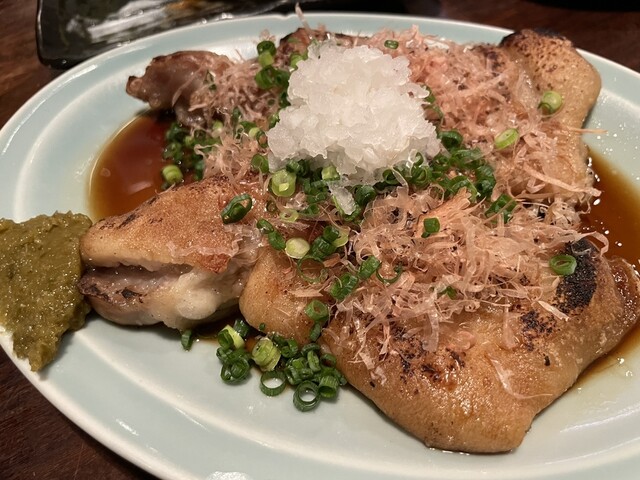 これ、骨が全部外してありまして、表面はカリッと焼いてあるけど中はトロットロ、それにポン酢とネギ、カツオブシ、おろし大根、柚子胡椒が添えてあります。