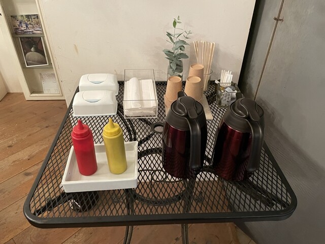 お冷はセルフでケチャップやマスタードも置いてあります。