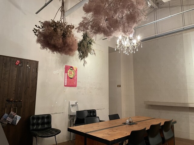 左側がレジと注文するところでその奥に厨房、右手側の店内にはイートインスペースあり、ちょっと天井も高いしドライフラワーが飾られててオシャレな空間です。