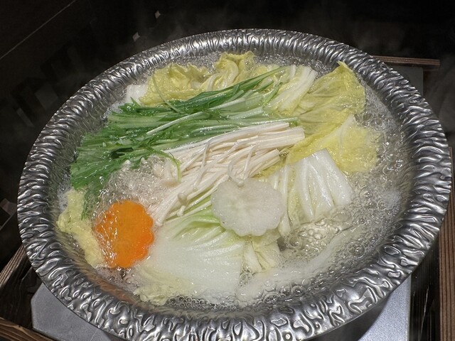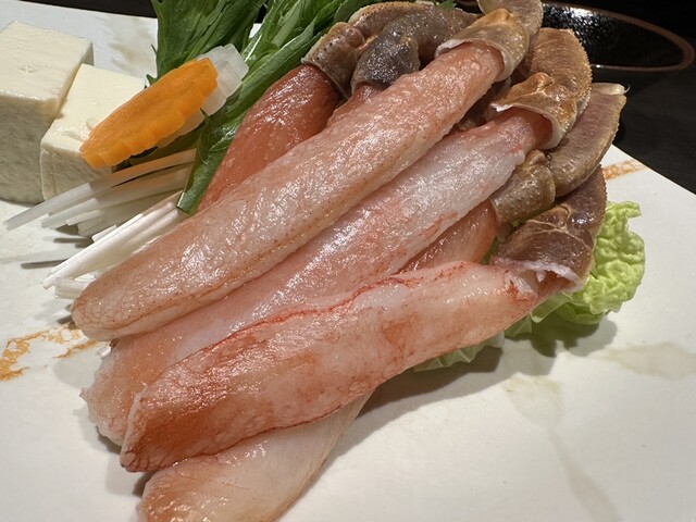 ズワイガニ、タラバガニ、白菜、水菜、エノキダケ、豆腐、ニンジン、大根の具材があり、先に野菜と豆腐を出汁で煮てある程度火が通ったらカニをしゃぶしゃぶして頂きましたが、カニが火入れの加減で食感が変わるのが楽しくて美味かったですね~。
