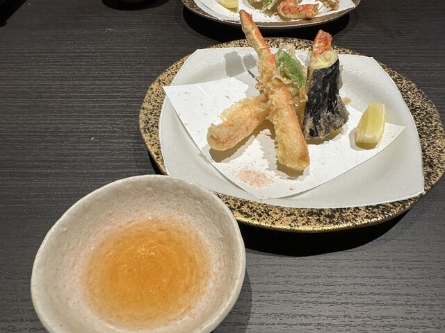 ズワイガニ足身とナスやヤングコーンの天ぷらを天つゆかレモン塩で頂きます。