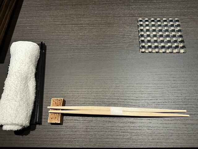 お店に入って突き当りにはカウンターがあり、実はそちらでもお鮨でもかにでも頂けるみたいなんですけど、通路途中右手に曲がって入る明るい鮨屋と違ってちょっとシックな雰囲気の個室が並ぶ区画に通して頂き、そちらのテーブル席に着席。