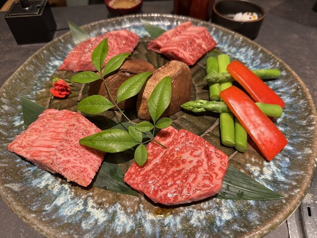 肉は時計回りにサガリ、上ハラミ、シンシン、カイノミ、ジャンボしいたけにパプリカ、アスパラガスが美しく並べられています。