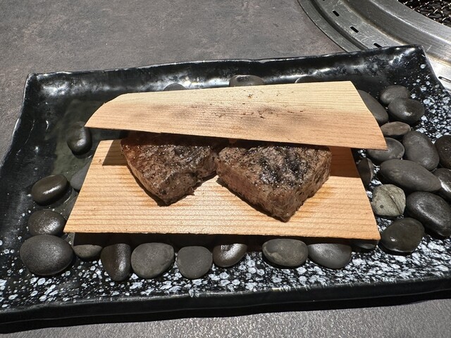 焼肉だから直接肉を焼かないと肉汁を封じ込められないし、でも杉の香りを移したいから周りで焼いて最後の提供の際は二枚の杉板に挟んだ状態で提供する、というのが頂いたシャトーブリアンはちゃんと杉の香りがするし、めちゃくちゃ柔らかい極上赤身肉がスッキリとした杉の香をまとって塩角が無い竹炭塩でちょうど良い塩梅の味付けもされていてそのまま食べて大満足です(^-^)
