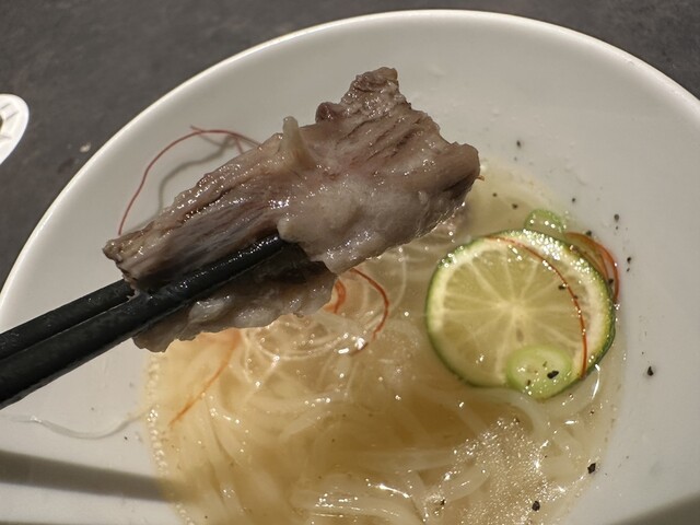 牛テールスープとテール肉、すだちと白髪ねぎ、ネギ、糸唐辛子が入ってますがスープ自体が美味い上、コシが強い麺で量こそ少ないけどしっかり満足!