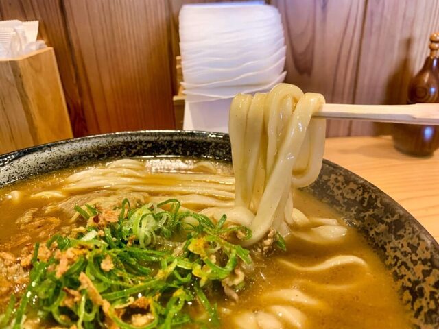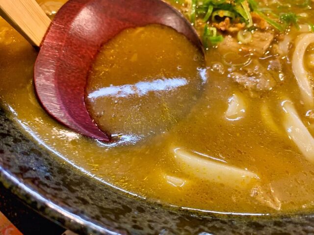 注文してから待つこと約10分、出てきたものを見てちょっと後悔しました。うどんの器がめちゃデカいんですよ。もちろん見掛け倒しではありません。中にはカレー出汁とともに麺がどっさり入っていて…「うどん2玉ってこんなに多かったっけ?」って感じでした。カレー出汁の味は昆布と削り節が程よく効いたオーソドックスなカレー出汁。スパイスは香るものの辛さ自体は控えめで、全体的に幅広い層に受け入れられやすい味でした。一方の麺は讃岐うどんというより平打ち麺で、ふわふわもちもちの食感が際立ってました。