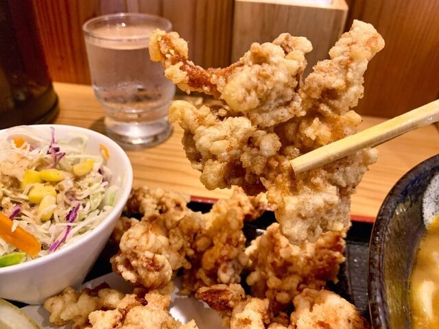 そして唐揚げもとにかくデカい!実際食べてみると、衣は比較的厚めでサクサク食感、中は胸肉でさっぱり系ながら、甘口に味付けされた醤油だれが断面からじんわりと滲み出てきます。そのまま食べてもいいですし、カレー出汁に浸して食べるのもいいですね。いやいや、やっぱりビールかな…