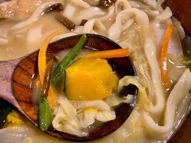 肝心のお味は、白味噌仕立ての薄味系のお出汁で、塩分が控えめなのでとっても優しい味です。でも、ただ薄味なだけじゃなく、具材として一緒に煮込まれた各種野菜から出汁がしっかりしみ出ているので、スーッと喉元を通った直後から旨味がじんわり広がっていく、疲れた身体に効きそうな滋養系のお出汁になっています。麺は太さも厚さもラーメン二郎のワシワシオーション麺の2〜3倍はありそうな極太の自家製麺。見た目にとってもワイルドなんですが、実は表面がツルッツルで口当たりがとっても気持ちいいです。そして、このお鍋に入っている野菜はにんじん、玉ねぎ、かぼちゃ…山菜を含めて全部で8種類くらいは入っていたかなぁ。肉や魚は一切入っていないので、ヴィーガン志向の人でも安心して食べられます。で、これらの具材を口の中に入れて噛みしめると、胡麻の香りがふわり…まだ他店との食べ比べはできてませんが、このお店のほうとうは確実にお勧めできるレベルだと思います。駐車場も完備してますし、河口湖近辺でお腹が空いたらぜひ一度お店に行ってみてください。