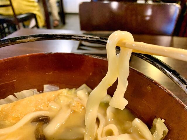 注文してから待つこと約10分、かなり大きな鉄鍋で山梨伝統の郷土料理・ほうとうが運ばれてきました。もちろんこれで1人前。ヘタをすると大人でも全部食べきれないんじゃ…ってくらいのボリューム感があります。言うまでもなく鉄鍋は熱々なので、不意に触って火傷しないように注意が必要です。