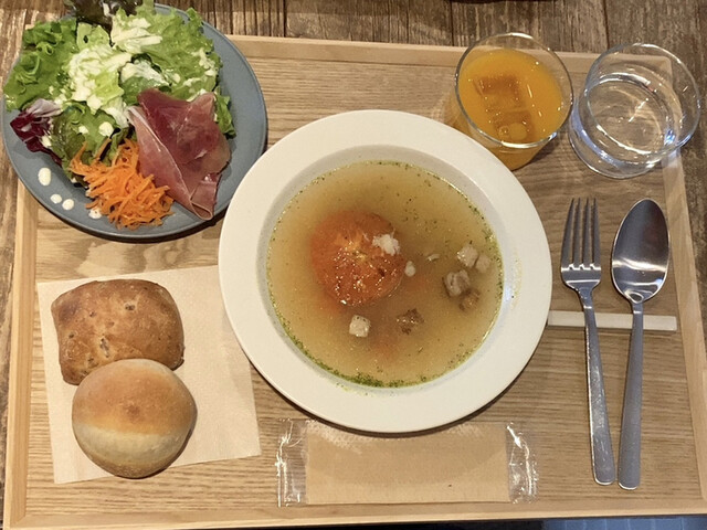 パン2個と生ハム野菜サラダ、ドリンク付き。