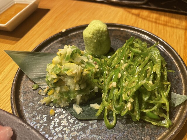 青唐辛子とタレ、卵を焼いたお肉の上からかけて頂きます。