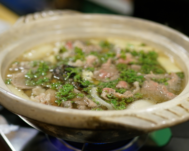 17 花山椒鍋1杯目(山形牛と物集女筍)