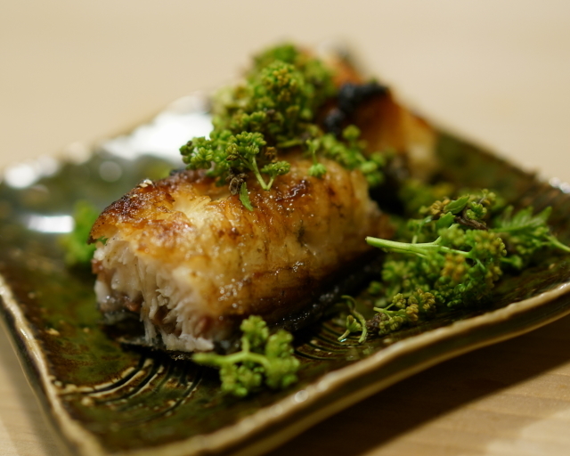 身は白焼きにして今の時期ならではの和ハーブ「花山椒」と一緒に。