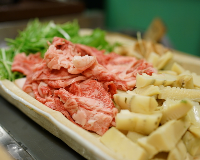 まずは山形牛と物集女の筍、水菜で。