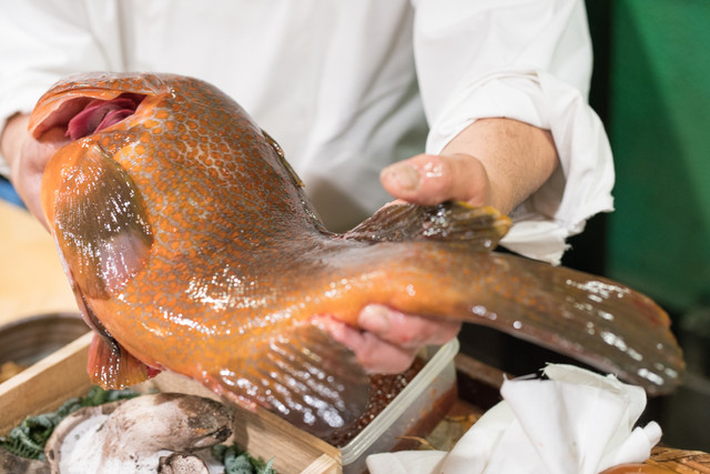 高級中華の清蒸を思い出すようなアズキハタの目玉、皮、頬の肉が堪りません。