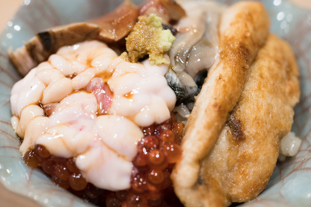 牡蠣、イクラ、雲子、ボラ白子ソテー、コシナガマグロ藁焼き、全部乗せの「ヤケクソ丼」。