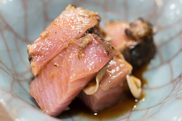 氷見のブリは豪快カットでニンニク醤油と合わせて藁焼きに。