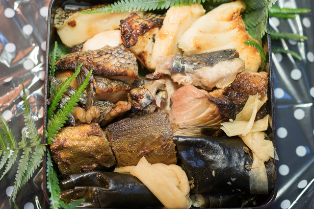 四の重は、メロウ、鰆、小女子胡桃、子持ち鮎甘露煮、穴子昆布巻、鮭昆布巻。