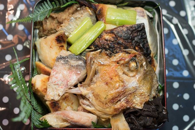五の重は、金目鯛、マナガツオ、色々な魚のアラ、セロリ、キクラゲ。