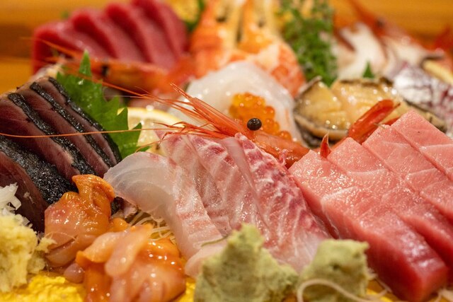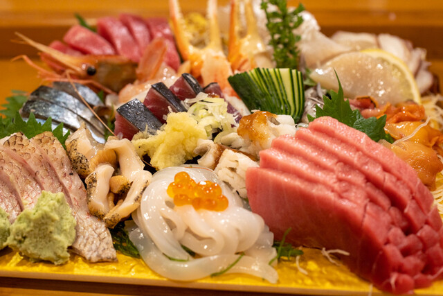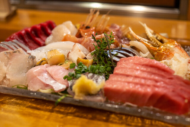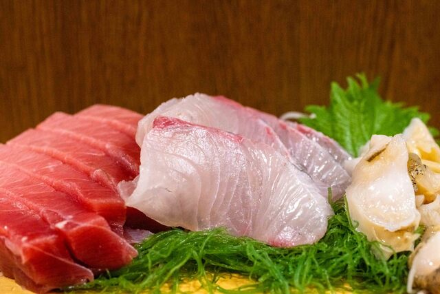 鰹(かつお)、ツブ貝、真鯛、甘海老、生帆立、本鮪赤身、本鮪中トロ、舞鶴産真鯵、