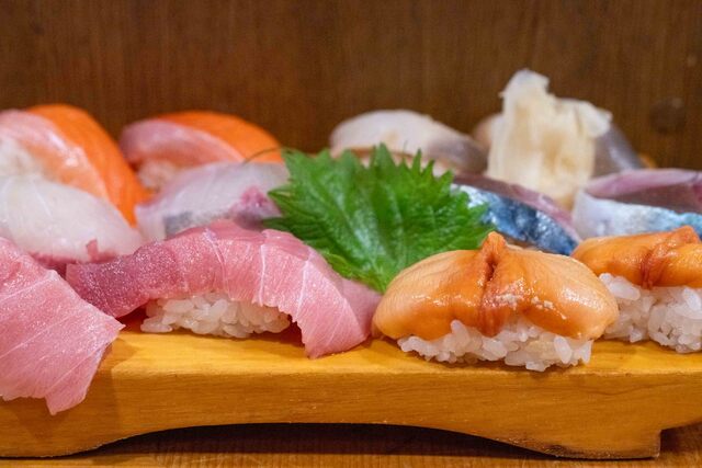 2025.5 スミイカ、ホッキ貝、あわび、ツブ貝、細魚、ひらめ、アジ、赤貝、中トロ、カンパチ