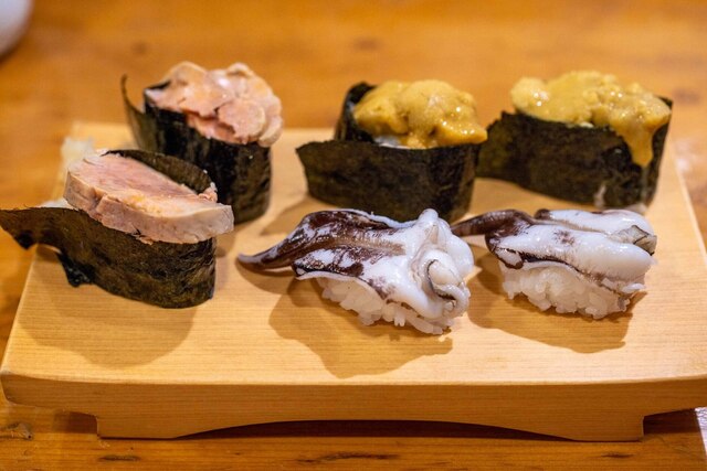 7.鮑(あわび)/ 8.ツブ貝 / 9.舞鶴産真鯵 / 10.あんきも軍艦 / 11.北海うに軍艦