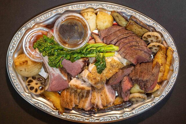 ラムラック、鶏モモ、豚肩ロース、付け合わせのグリル野菜と焼き林檎、